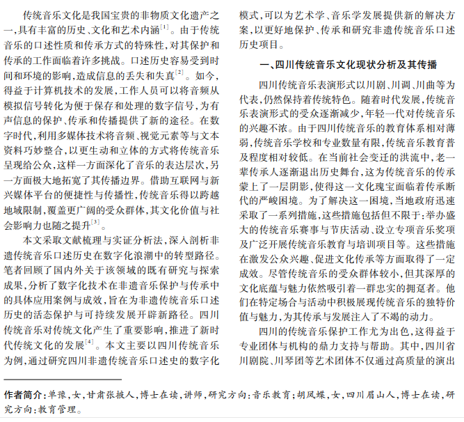 本文主要研究四川非遗传统音乐口述史数字化模式,构建非遗传统音乐口述史数据库,实现非遗 传统音乐的有效传承和高效传播。本研究结果表明,建立非遗传统音乐口述史数字化模式对于传承和推广传 统音乐具有重要意义。