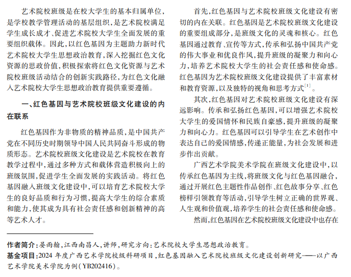 班级作为大学生的基本组织形式,是学生参与教育教学、集体活动、制度化管理的基本单位,也是 学校开展教育管理的主阵地。当前艺术院校班级文化建设面临诸多挑战,如班级成员价值观的多元化和个性 化、社会环境对班级文化的影响等。在这样的背景下,将红色基因融入艺术院校班级文化活动,对提升班级成 员思想道德素质、培养艺术院校大学生的社会责任感和使命感,具有现实意义。