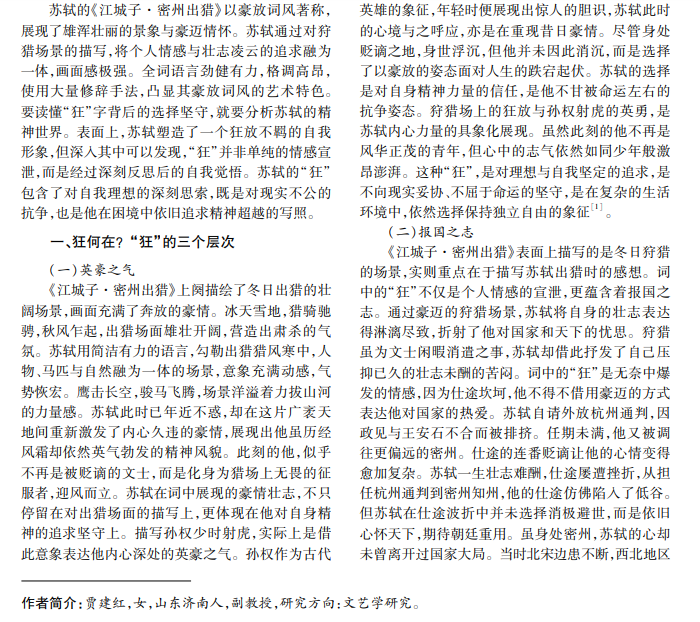 苏轼,字子瞻,号东坡居士,北宋杰出的文学家、书画家。苏轼曾因“乌台诗案”被贬黄州,但逆境并 未摧垮其精神,反而淬炼了他的思想境界,逐渐形成他超然的处世哲学。《江城子·密州出猎》标志着苏轼词风 的重大转变,塑造了“狂我”的形象,展现了他蓬勃的生命力。本文从狂何在、狂何为、何以狂三个角度展开论 述,试读懂苏轼“狂”字背后的选择和坚守。