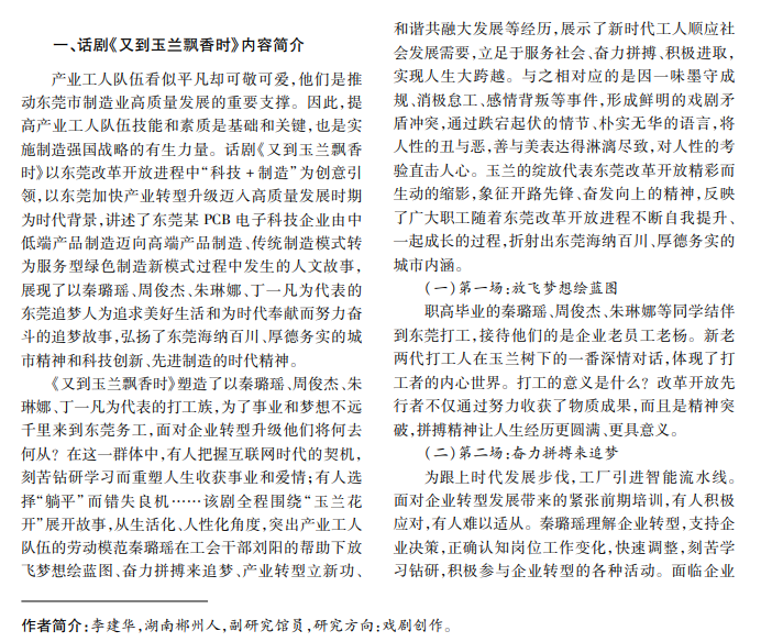 改革开放 45周年来,城市的发展离不开数以亿计的产业工人。话剧作品《又到玉兰飘香时》以建 设创新型国家时代背景为经,以东莞产业工人小人物为纬,跳出打工文艺的叙事局限,塑造了以秦璐瑶为新时 代产业工人代表的弄潮者形象。整部作品没有空洞的喊口号,而是通过将人的情感与产业发展关联,凝聚新时 代产业工人敢于创新的改革精神,呈现了一部有情怀、有主题、有艺术水准的话剧作品。