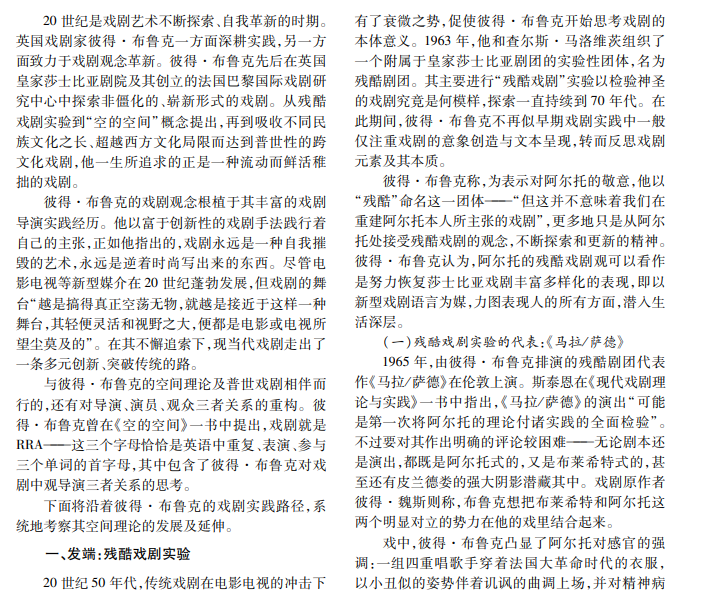 彼得·布鲁克作为当代戏剧的探索者和实践者,为后世留下了宝贵遗产:从残酷剧团系列实践到 “空的空间”理论成型,再到对跨文化的普世戏剧的追求———其实践探索为现当代戏剧打开了更广阔的研究视 阈。本文以“空的空间”理论为基础,探究彼得·布鲁克系列戏剧思想主张源流及其对后世的影响。
