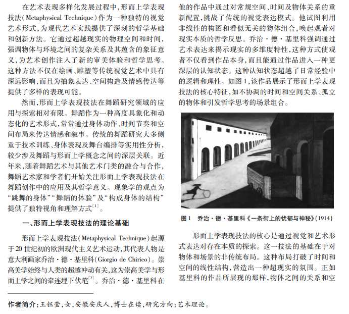 形而上学表现技法源于 20世纪初的欧洲现代主义艺术运动,意大利画家乔治·德·基里科等人 通过非线性处理时空结构和物体关系,为艺术作品赋予了多重解读空间。在舞蹈中,这一技法首先体现在时间 和空间的非线性表达上,重新定义了观众与作品之间的关系,增强了互动性和解读的多样性。本文主要分析这 一技法在当代舞蹈作品中的应用,指出其为舞蹈创作带来的挑战与机遇,并讨论其在舞蹈创作研究中的潜力。