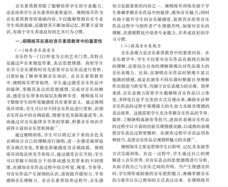 视唱练耳是高校音乐专业中的基础课程之一,对高校音乐素质教育有重要意义。本文对视唱练耳 的重要性进行分析,发现其能够提高学生的音乐表现力、音乐创造力、音乐感知力及音乐记忆力等音乐素养。 因此,本文提出了开展视唱练耳的建议,旨在为高校音乐素质教育提供参考。