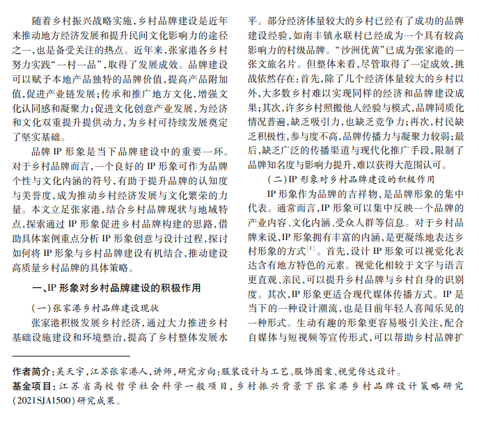 进入新时代,乡村品牌建设成为推动地方经济发展和文化传承的重要途径之一,但面临品牌同质 化、缺乏传播力等问题。本文立足张家港乡村品牌现状,首先分析 IP形象在乡村品牌建设中的积极作用,然后 提出 IP形象设计原则、设计策略与传播策略,最后讨论乡村品牌 IP形象的可持续发展战略,旨在为张家港乃至 其他地区的乡村品牌建设提供参考和借鉴,助力乡村振兴和可持续发展。