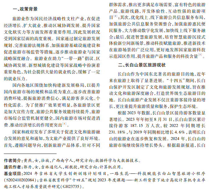 本文利用微信小程序的开发优势,分析吉林 5A级景区长白山旅游现状,结合长白山自然资源、地 理位置、游玩景点和餐饮住宿等资源进行微信小程序的设计和开发,为游客提供路线、酒店、美食及购买周边产 品等便捷服务,助力长白山文旅事业向智慧转型,推动当地经济发展。