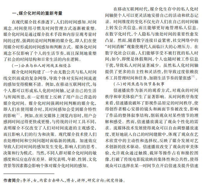 在信息化时代背景下,媒介作为人类生产和生活中的关键工具之一,已成为不可或缺的中间环节。 在媒介化生存中,虚拟与现实的界限变得模糊,虚拟与现实的融合不仅重新界定了人类、媒介及其生存环境的 基本概念,而且深刻影响了人类生存的时间与空间感知、对真实性的认知和对价值体系的构建。媒介化时间呈 现出公共与私人时间线互相侵占、社会加速和时间焦虑导致的快节奏叙事等特征。媒介化时间与影像空间的 虚实交合是现代社会发展的必然产物,既带来便利和机遇,也带来挑战和问题。