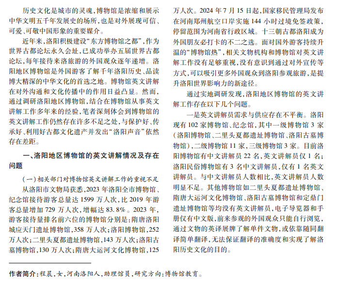 随着中国国际化水平不断提升,博物馆成为外国观众了解中国历史文化的重要窗口。其中,英文 讲解员是连接中国历史与外国友人的重要纽带。目前,洛阳博物馆在英文讲解工作方面存在讲解员数量不足、 培养机制不健全、专业培训不足等问题,与新形势下讲好文明交流互鉴的“洛阳故事”存在差距。本文针对问 题,提出做好博物馆英文讲解工作的建议。