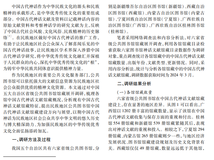 本文深入梳理与分析我国五个自治区六个省级公共图书馆中国古代神话文献馆藏情况,提出民族 地区公共图书馆中国古代神话文献资料馆藏建设方向与展望,希望为中国古代神话在新时期为民族地区社会 公众共享中华文明的悠久历史与博大精深助力、为加强民族地区中华优秀传统文化弘扬添砖加瓦、为铸牢中华 民族共同体意识贡献力量。