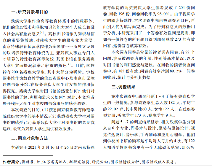 本文分析南京特殊教育师范学院图书馆为残障大学生提供的服务体验,通过问卷调查,发现残疾 大学生对纸质资源比较依赖,而电子资源利用率较低,本文对此提出相应建议,以提升服务质量,满足残障学生 多元化需求,希望对改进图书馆残疾读者服务具有指导意义。