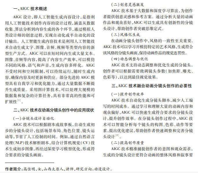 随着 AIGC技术不断进步和应用深入推广,其与动画分镜头创作结合,在动漫创作领域发挥出色。 本文从 AIGC技术的发展、AIGC技术融合动画分镜头创作的必要性、AIGC技术融入动画分镜头创作等方面,探 讨 AIGC技术在动画分镜头创作中的应用。