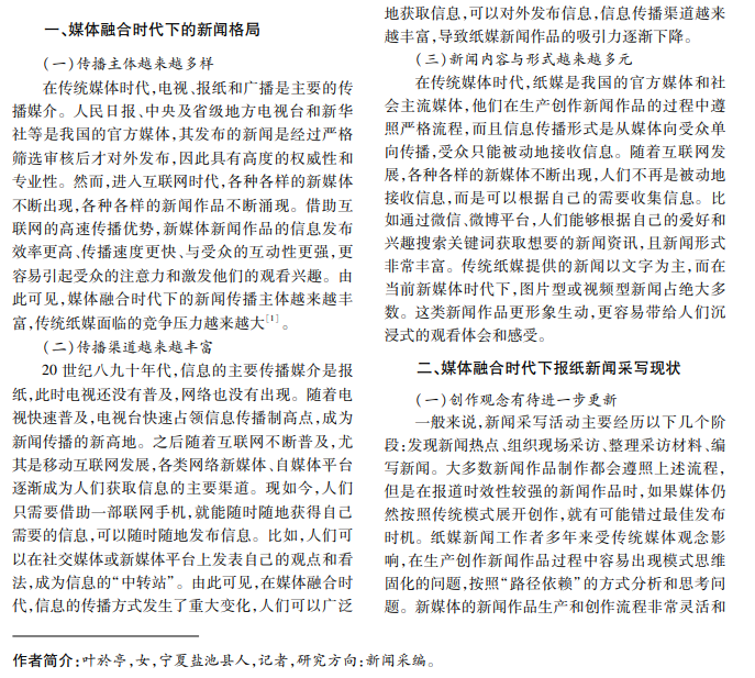随着融媒体时代到来,传统媒体和新媒体融合趋势越来越明显,社会对媒体产品和服务的要求越 来越高,受众接受信息的方式更加多样。“人人皆是媒体人”的融媒体时代给纸媒等传统媒体带来强烈冲击,报 纸新闻采写转型势在必行。本文分析媒体融合时代下的新闻格局,阐述报纸新闻采写现状和问题,提出报纸新 闻采写转型策略。