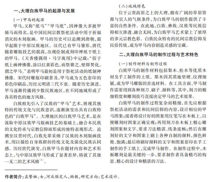 大理白族甲马是民间祭祀祈福时使用的木板雕刻印刷品,具有深厚的文化底蕴和独特的艺术风 格。随着现代设计理念不断发展,将甲马元素融入艺术设计中,不仅丰富了设计语言,而且促进传统文化传播 与传承。本文分析甲马的历史起源、艺术特征、文化内涵及其在当代设计中的融合实践,提出甲马元素在视觉 传达设计中的应用策略,以期推动其在现代设计中创新发展,实现传统文化的保护与传承。