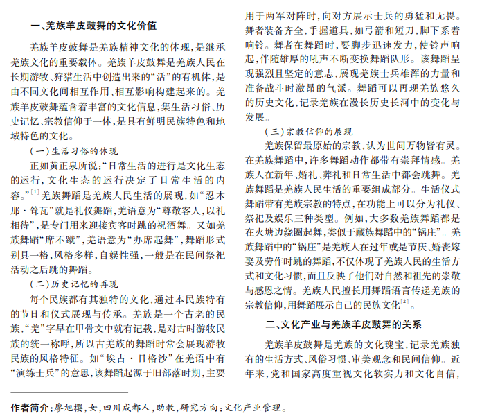羌族羊皮鼓舞作为国家级非物质文化遗产,是传承羌族文化的重要载体,蕴含羌族人民的历史记 忆、生活方式和宗教信仰。随着文化产业兴起,羊皮鼓舞传承与发展迎来了新的机遇和挑战。本文从文化产业 视角出发,探讨羊皮鼓舞在当代社会的文化价值、历史意义和传承方式,力促其在现代社会的活态传承与发展。