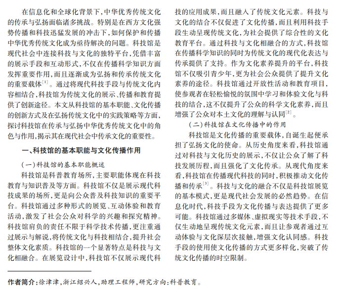 本文首先分析科技馆作为科学教育基地的基本职能,探讨其在科技与文化融合背景下推动传统文 化传播的独特优势,然后论述科技馆如何借助现代科技手段,提升传统文化的展示效果和互动体验,展现了科 技馆在文化传播中的创新性。科技馆不仅是传统文化的守护者,更是推动传统文化传播的创新平台。科技馆 在科技和文化的双重结合下,为传统文化传播注入了新活力,促进其在当代社会的传承和发展。