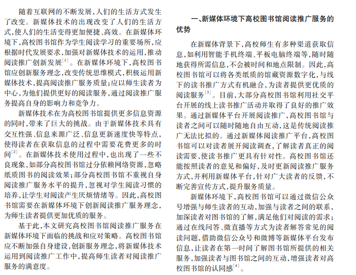 新媒体作为信息时代的产物,以其海量信息、交互便捷、互动性强等特点,成为人们获取信息的重 要渠道。在新媒体环境下,高校图书馆需要创新传统的阅读推广方式,充分利用微信、微博、移动客户端等新兴 网络技术手段,加强与读者的互动和沟通,丰富阅读推广内容,提高阅读推广效果。高校图书馆应以师生读者 需求为导向开展阅读推广工作,根据阅读需求和兴趣点制定阅读推广活动主题。