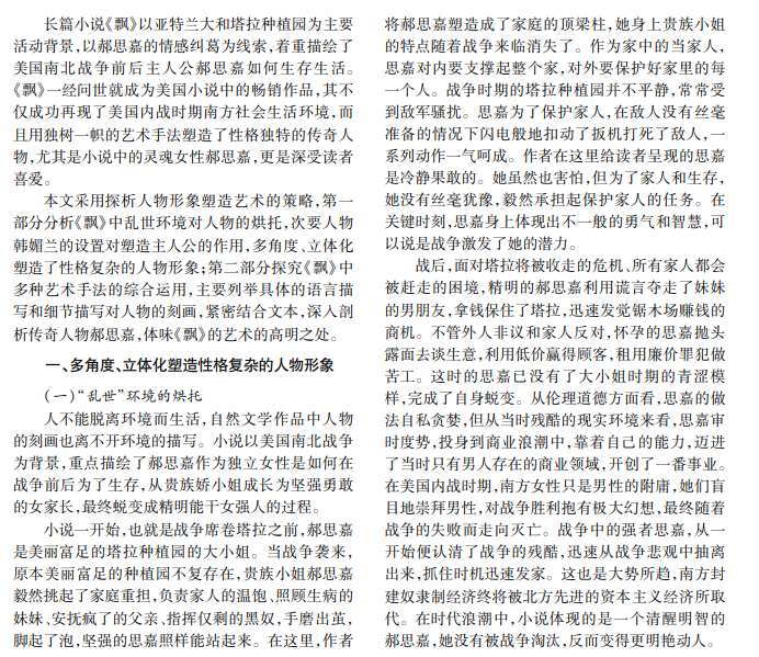 长篇小说《飘》是玛格丽特·米切尔享誉全球的作品。本文从《飘》塑造的郝思嘉形象的特点和综 合运用多种艺术手法刻画人物两方面入手,探究小说中人物形象的塑造艺术。《飘》极具特色的人物塑造手法 不仅成功刻画了经典人物郝思嘉,而且丰富了小说艺术内涵,增强了可读性。