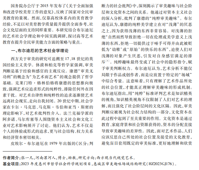 本文基于法国社会学家布尔迪厄的艺术社会学理论,以问卷方式对惠州三个不同常住群体展开实 际调研,通过实际数据分析,将不同群体的个人审美差异置于社会中,探讨艺术类型偏好、题材偏好、对当代艺 术的接受度等问题以及与文化资本积累、教育层次高低等之间的关系,并以此为依据探讨当下高校艺术工作中 存在的问题。