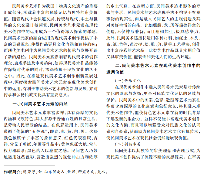 深度挖掘民间美术艺术元素,积极探索现代美术创作的创新之路,能提高美术创作效果,实现对民 间美术艺术的传承,提高美术艺术创作的整体质量。本文从民间美术艺术入手,重点对现代美术创作中民间美 术艺术的多元化应用进行深度探究,提出合理化创作建议,旨在使美术创作凸显民间艺术特色,彰显民族艺术 风格,促进现代美术创作良好发展。