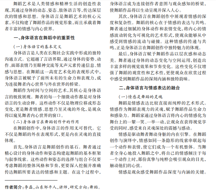 舞蹈通过身体语言来展现各种动作,以有节奏的动作为主要表现手段,用以传递情感和思想。本 文探讨舞蹈艺术中身体语言与情感表达的关系,分析身体语言在舞蹈创作中的重要性以及如何通过身体语言 来传达和深化舞蹈作品中的情感。通过理论分析与实际案例相结合,揭示舞蹈艺术不仅是动作的展现,更是情 感的流露和灵魂的呈现。
