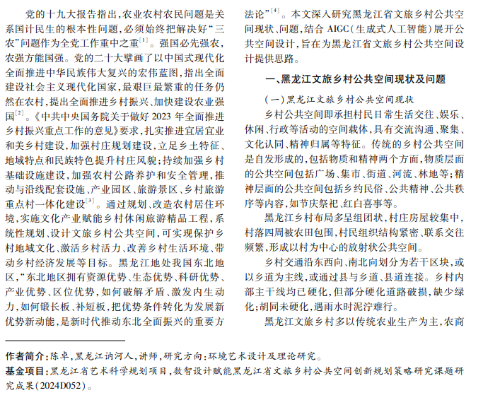 乡村振兴视域下,加快文旅乡村建设是培育文旅产业、带动经济发展的重要举措之一。公共空间 是文旅乡村社交、娱乐、展示地方文化等活动的空间,设计效果直接影响文旅乡村建设成效。本文立足乡村振 兴和东北振兴战略,结合实地调研,分析黑龙江文旅乡村公共空间设计现状和存在的问题,结合不同群体对公 共空间的需求,提出基于生成式人工智能设计公共空间的数字化思路,以及文旅乡村公共空间细部设计可行性 方案。
