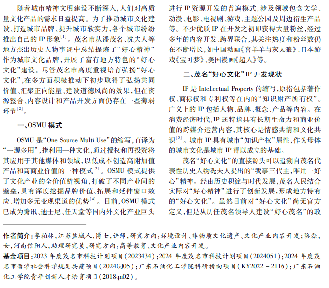 为提升城市软实力,茂名市从当地传统文化中提炼出“好心文化”作为城市文化品牌进行建设。本 文基于 OSMU模式,对“好心文化”的发展现状进行文献研究和案例分析,并从文化叙事设计、文化形象设计及 内容生产形式三个方面提出开发策略,希望这些策略能为“好心文化”的进一步建设提供政策建议,并为其 IP 开发提供思路。