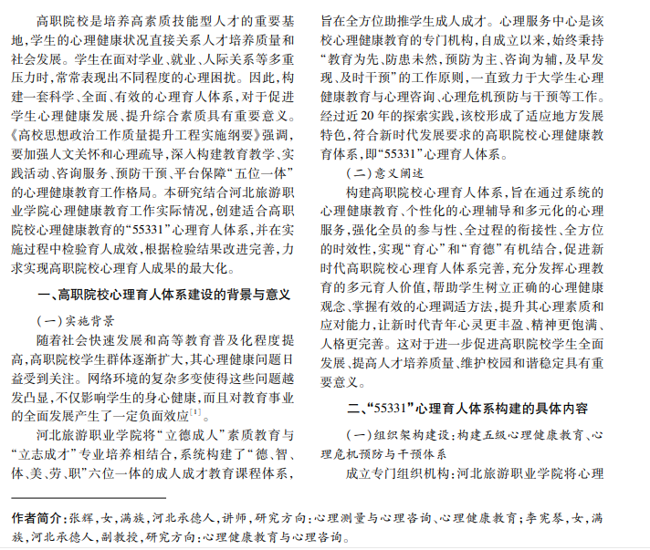 本文以河北旅游职业学院为案例,从组织架构、制度机制、课程体系、服务保障队伍、咨询服务 5个 方面详细阐述“55331”心理育人体系,根据其实施效果探讨改进方向,力求构建科学有效的心理育人体系,以促 进学生心理健康发展,提升人才培养质量。
