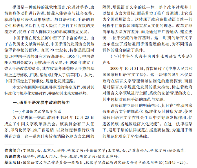 本文分析通用手语标准化的背景、动因和影响因素,并结合当前信息技术发展,对未来通用手语的 标准化、规范化与信息化趋势进行展望,旨在为通用手语的历史研究提供深入理解的途径,并为推动手语的规 范化、标准化及信息化发展提供参考和借鉴。