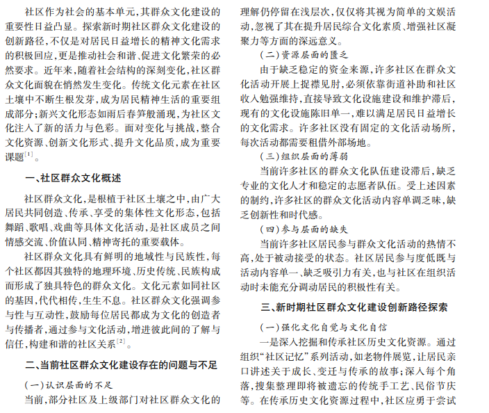 新时期,社区群众文化建设不仅关乎居民的精神文化生活质量,更是构建和谐社区、推动社会整体 进步的关键一环。因此,探索新时期社区群众文化建设的创新路径具有重要意义。本文分析新时期社区群众 文化建设存在的问题与不足,提出系列创新路径,以期为新时期社区群众文化建设提供新的思路和方法。