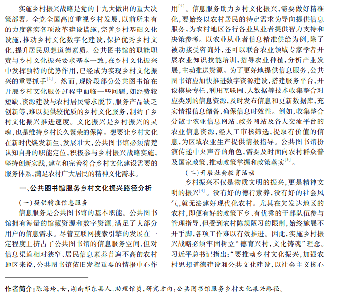 乡村文化振兴是我国公共文化事业发展的重要组成部分。作为公共文化服务的供给主体,公共图 书馆有责任、有义务参与乡村文化建设,以高水平文化服务带动乡村文化振兴。基于此,本文对部分地区公共 图书馆服务乡村文化振兴现状展开研究、整理和分析,阐述公共图书馆服务乡村文化振兴的主要路径,探讨目 前部分公共图书馆服务过程中面临的主要问题,从主体建设、需求对接、职能履行、聚集社会合力等方面提出服 务优化策略,以提升公共图书馆服务效能,助力乡村文化振兴。