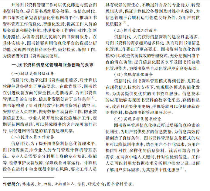当前,图书馆系统设备持续更新,信息化管理效率提升,为图书资料信息化管理创造了条件。在工 作中,图书馆需要创新信息化管理路径,增强工作人员的服务意识,提升其服务技能,最大限度发挥图书资料的 功能作用。本文分析图书资料管理信息化和创新服务路径,旨在实现图书资料智能化、信息化管理,为人们提 供更优质的服务。