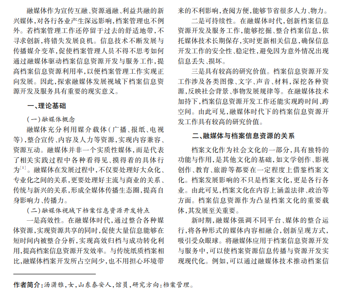 融媒体发展视域下,档案信息资源开发及服务工作要求具有媒体思维,将传统媒体与新兴媒体相 结合,扩展档案信息资源开发及服务路径,提高档案信息资源利用率。本文阐述融媒体概念及融媒体与档案信 息资源的关系,分析融媒体发展视域下档案信息资源开发及服务现状,提出开发及服务的具体路径。