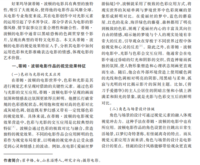 在蒂姆·波顿的电影视觉元素中,色彩和光影结合是典型特征。在电影创作中,蒂姆·波顿注重 多元化的色彩运用,实现现实与幻想交叉的效果,并注重营造反差感,丰富电影视觉效果,从侧面体现对电影视 觉元素出色的应用技巧。通过本文分析可知,蒂姆·波顿电影视觉元素通过无色彩与多色彩的融合应用、真实 与幻想色彩的搭配应用、光线亮度的灵活应用,营造光影交错的艺术氛围,提升电影创作中视觉元素呈现效果。