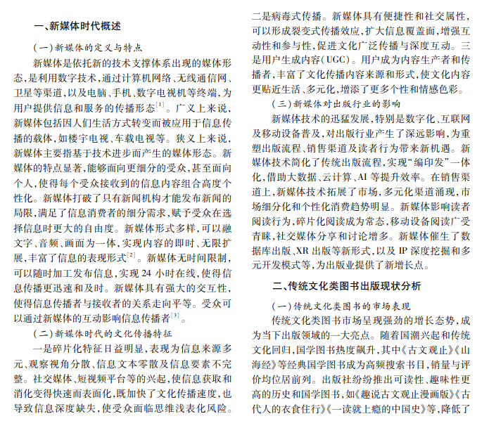 新媒体时代背景下,传统文化类图书应深挖文化内涵,采取融合出版、多媒体互动、建立读者社群 等方式促进传统文化类图书出版优化创新,实现可持续发展。本文分析时代特点、传统文化类图书市场表现、 读者群体、出版困境与机遇,探讨创新策略,结合《宋宴》一书总结内容、形式、营销策略创新的实践经验。