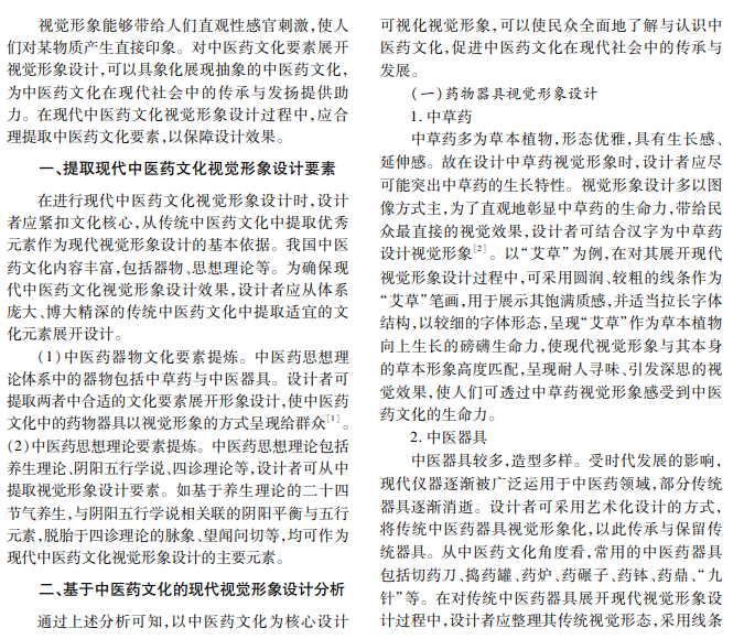我国中医药文化璀璨夺目,提取中医药文化元素展开视觉形象设计,可以使中医药文化在现代社 会中得到更好地传承与发扬。基于此,本文提取现代中医药文化视觉形象设计要素,从药物器具、中医诊法、阴 阳五行、中医养生四个角度出发,提出现代中医药文化视觉形象设计思路,以供参考借鉴。
