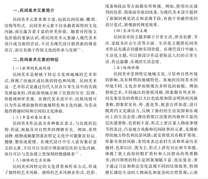 随着全球化不断发展,传统文化与现代设计结合成为美术设计的一大趋势。民间美术作为传统文 化的重要组成部分,其独特的艺术形式和深厚的文化底蕴在现代美术设计中展现出新的生命力。本文探讨民 间美术元素在现代美术设计中的融入方式与意义,以实例说明民间美术元素如何在现代设计中发挥独特魅力。