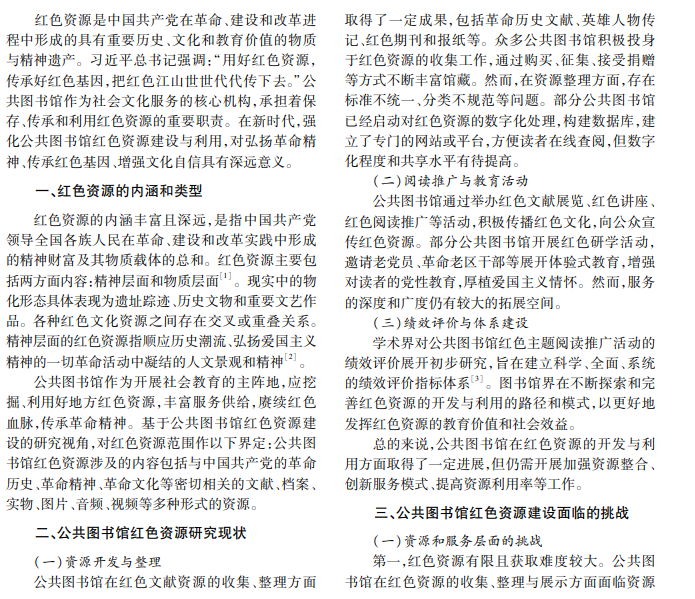 红色资源是生动的历史,是党和国家弥足珍贵的精神财富。公共图书馆在传承红色文化、服务社 会大众、推动社会发展中发挥着重要作用。本文着重探讨公共图书馆在红色资源建设与利用方面的重要性、现 状、挑战,提出一系列具有针对性的建议,以促进公共图书馆红色资源高效建设与利用。