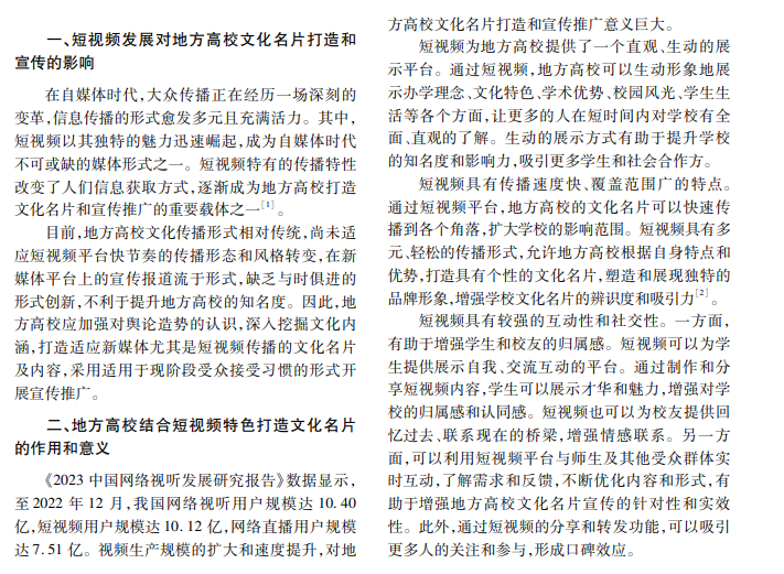 短视频的快速发展为地方高校文化名片打造与宣传带来了新机遇。短视频以其灵活互动、精准推 送等特点,深受公众喜爱,对高校文化宣传推广产生深远影响。本文基于短视频特点,分析其对地方高校文化 名片打造与宣传的影响,探讨有效的打造策略与宣传路径,以助力地方高校文化传播与品牌建设。