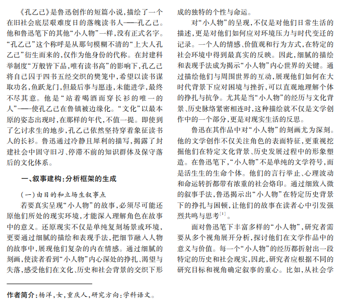 鲁迅笔下的“小人物”既是其文学作品的重要组成部分,也是贴近生活、反映现实的形象。本文以 孔乙己为例,从叙事学角度分析孔乙己的心理。孔乙己的心理受内外环境双重影响,显现出丰富的层次,心理 本质表现出抗争性、时代性与影射性。