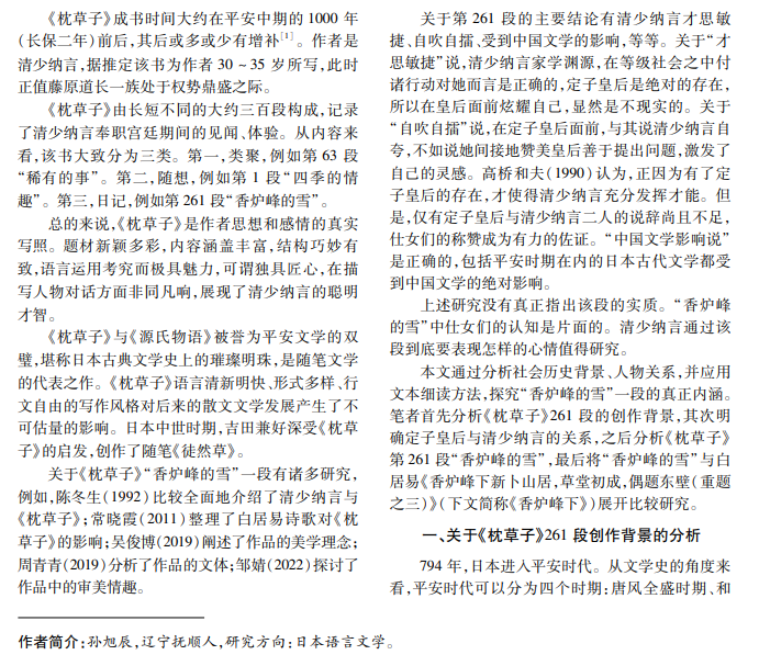清少纳言的《枕草子》开辟了日本随笔的先河,与《源氏物语》并称为平安女性文学的双璧。本文分 析《枕草子》中“香炉峰的雪”一段,细读该段可以发现古今日语的差异,感受日本人他律的性格特征,积极学习 中国文化的热情并达到得心应手、融会贯通的境界。