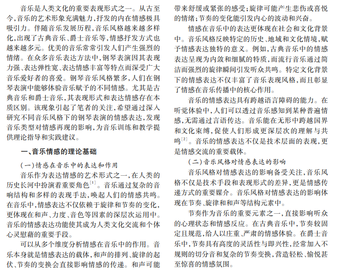 本文对比古典音乐与爵士音乐在钢琴表演中的情感表达,运用音乐情感理论分析节奏、旋律、和声 等元素表现,发现古典音乐多通过和声变化和细腻触感表达情感,爵士音乐常用即兴的节奏和旋律变化传递情 绪,该发现深化了对钢琴表演的情感表达的理解和把握,为音乐表演者在不同风格下的情感传达提供指导。