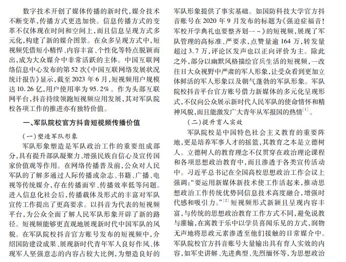 近年来,国内各院校纷纷入驻短视频平台以提升影响力,部分军队院校也加入传播矩阵。军队院 校官方短视频传播力持续提升,逐渐成为军队院校塑造军队形象、提升育人实效、发布官方信息、推进校园文化 建设的重要阵地,在军队院校政治工作中发挥着重要作用。本文以抖音平台为例,分析军队院校官方短视频的 传播价值,探索传播价值强化路径,为军队院校宣传工作优化提供参考。