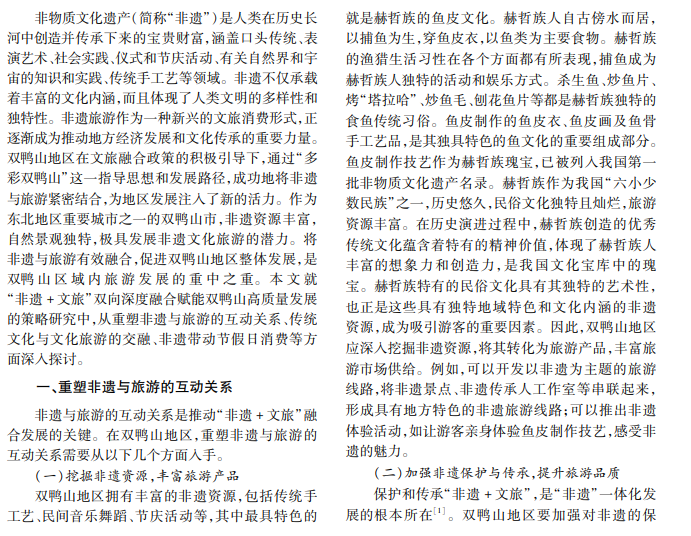 本文通过分析非遗与旅游的互动关系、传统文化与旅游产业的交融、非遗带动节假日消费等方面, 探讨双鸭山市通过发现传统珍宝、繁荣旅游市场、促进传统文化焕发新生等策略,以“非遗 +文旅”双向深度融 合赋能“多彩双鸭山”战略高质量发展的实践探索。