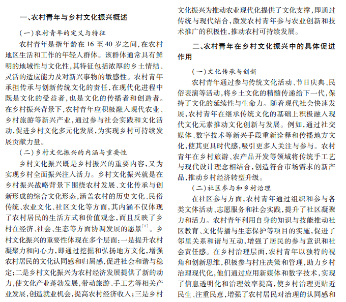 农村青年在乡村文化振兴中发挥着举足轻重的作用,凭借鲜活的创造力和勇于探索的精神积极参 与乡村文化传承与创新,激发社区活力并增强乡土文化自信。农村青年在乡村文化振兴建设中不仅展现了自 身价值,也为未来乡村发展描绘了美好蓝图。