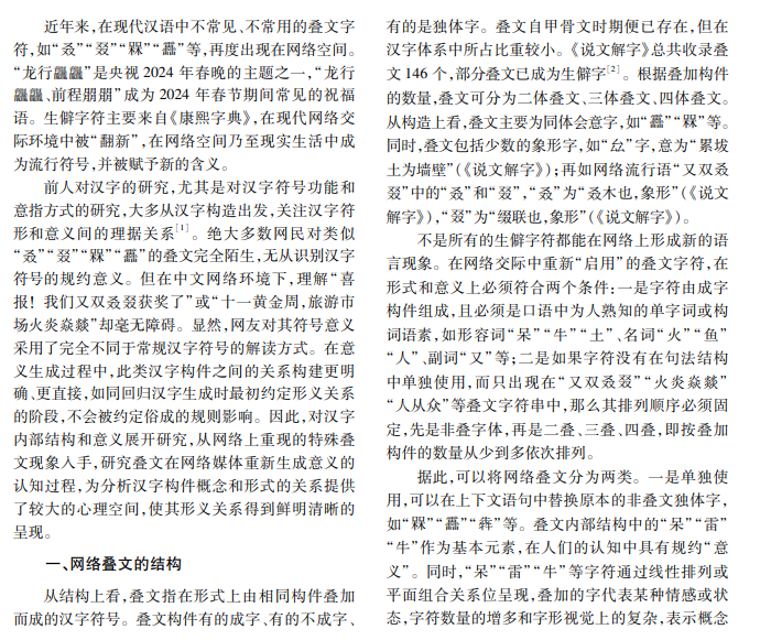 本文运用溯因推理方法,探讨生僻叠文字符在网络环境中的再现过程及意义生成过程,解析叠文 字符的结构特点,结合“又双!"”等网络用语现象,揭示其如何通过认知过程重塑汉字的符号意义。网络叠文 现象反映了汉字符号的去规约化特征,展现了汉字在数字时代的演变与重塑趋势。