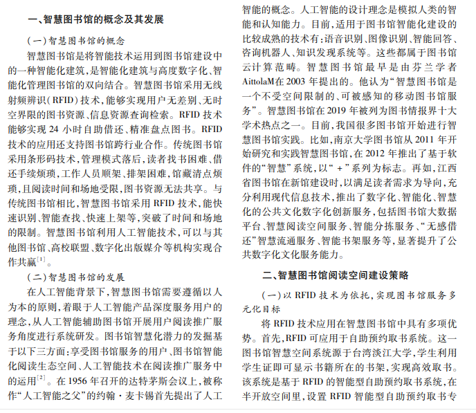 在人工智能背景下,图书馆智能化转型、智慧图书馆建设成为图书馆行业的发展趋势。图书馆通 过提升数字化水平,营造创新的阅读环境,可以增强用户阅读体验,满足读者个性化需求。图书馆阅读环境和 场景构建是传统图书馆向智慧图书馆转型发展的重要布局。