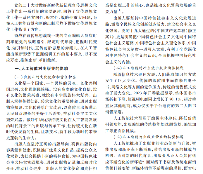 随着人工智能技术快速发展,出版业正面临前所未有的变革。本文通过分析人工智能技术对出版 业的影响,阐述编辑的角色转变,探讨编辑在人工智能背景下的生存路径,旨在帮助编辑在人工智能时代找到 自身定位,为出版业高质量发展贡献力量。
