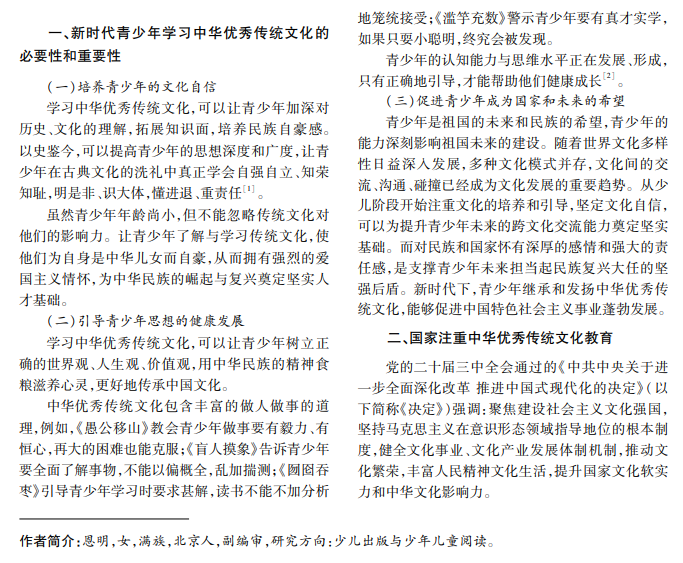 本文主要分析中华优秀传统文化在青少年成长中的关键作用,包括在培养民族自豪感、思想引领 和国家未来建设中的重要性。在新时代背景下,应加强对中小学生的传统文化教育。《智慧成语故事》系列图 书为青少年提供了学习传统文化的有效途径,从而提高其文化素养,以便更好地传承民族精神。