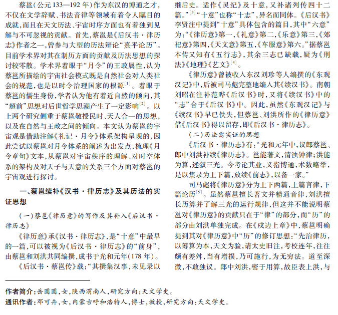 通过对蔡邕《戍边上章》《月令章句》等相关著作的整理与分析,本文认为蔡邕不仅在续补《汉书· 律历志》方面有着重要的贡献,而且表现出历法需实证的态度与独到的制历思想。在宇宙观方面,本文认为蔡 邕对月令体系中的时空观念与天人思想作了进一步发展与细化,将四时、阴阳、五行相结合,构建起一个以顺应 自然规律为核心的运转体系。