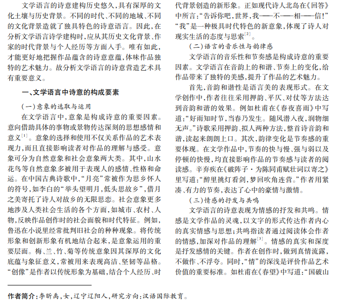 文学作为人类精神财富的瑰宝,自诞生以来便以其特有的魅力吸引了众多读者。在文学这片广袤 的土地上,语言不仅是传达信息的工具,更是营造意境和表达情感的载体。诗意作为更高层次的文学语言,将 语言艺术推到了新的高度。深入剖析文学语言诗意营造艺术,可以加深大众对文学作品的理解与欣赏,激发审 美情趣,提高文化素养。因此,分析文学语言的诗意营造艺术成为热议的课题之一。