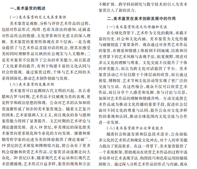 美术鉴赏在推动美术创新发展中扮演重要角色,不仅是艺术作品与观众之间的桥梁,更是文化传 播和审美教育的核心。通过鉴赏活动,公众更好地理解艺术内涵,提升审美能力。美术鉴赏为艺术市场发展注入 了活力,推动了艺术品流通。美术鉴赏不仅丰富了人们的文化生活,而且为美术创新性发展提供了新的动力。